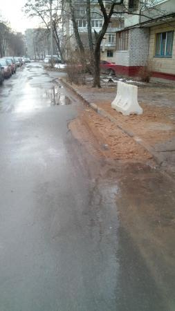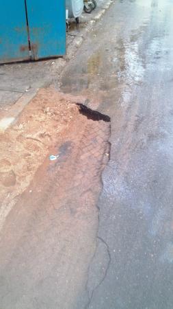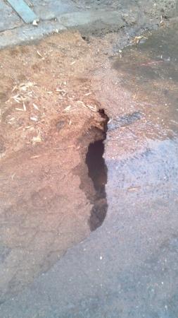 фотографии сделаны 20.02.2015г. Ранее дефект дороги был засыпан песком. С приходом тепла это место подмыло и вот-вот образуется обвал.Яма находится возле точки сбора мусора, между домами 61 и 59 по ул. Голодеда.