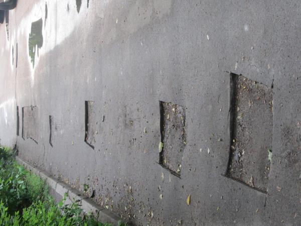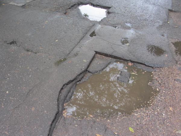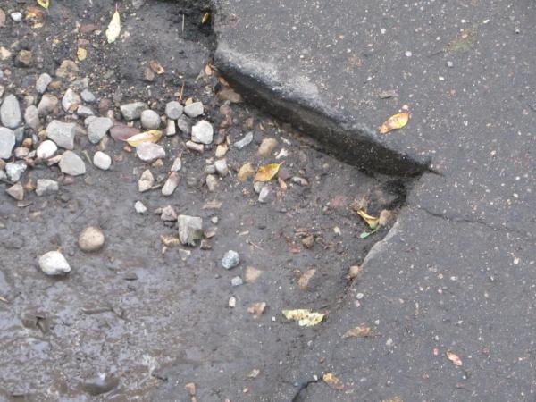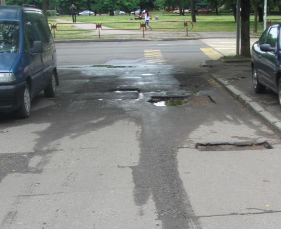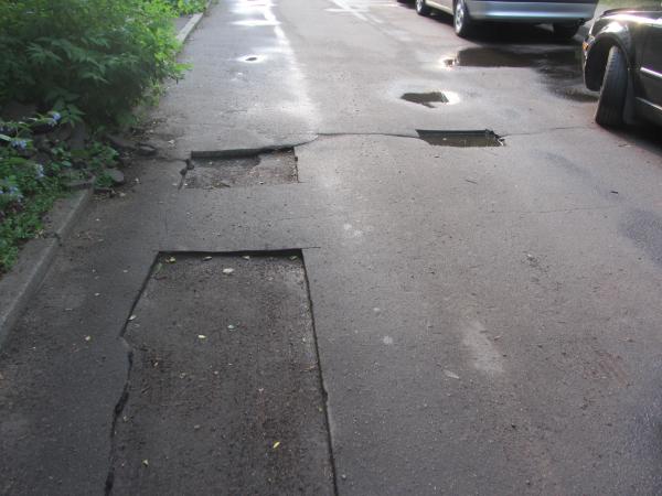 несколько десятков дефектов/ Возле 79 дома ямы засыпали. теперь он возвышаются над дорогой. А рядом лежат вырезанныфе куски асфальта. Множество ям возле 77 и 83 домов