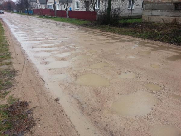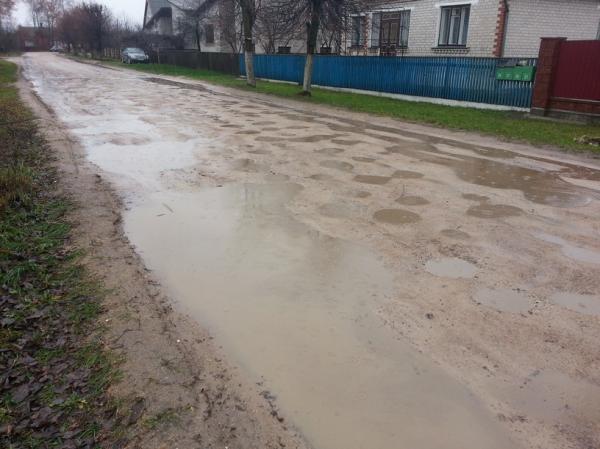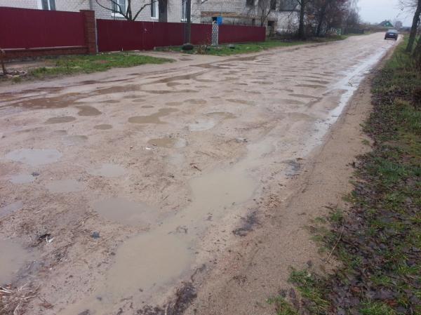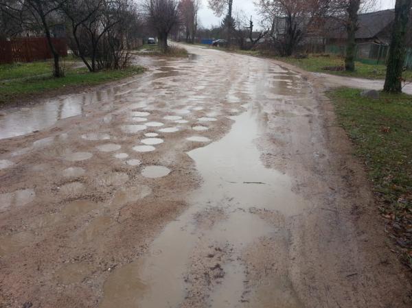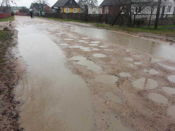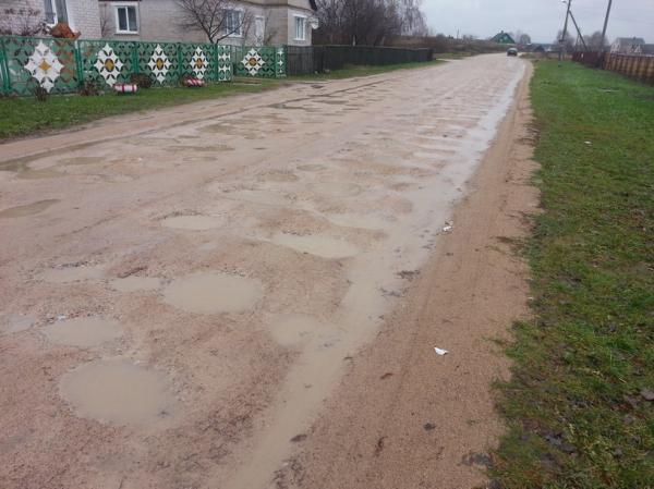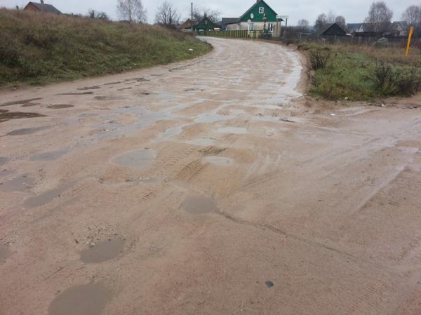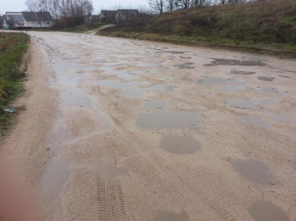 После съезда с асфальта в сторону деревни Петралевичи, начинается 600 метров гравейки (в д.Петралевичи асфальт, почему не положить его на этом участке не понимаю) которая находится в таком состоянии после каждого дождя. Ее иногда ровняют грейдером, но после дождя снова тоже самое. Машины едут на 1 передаче на холостых, подвеска убивается ужасно.