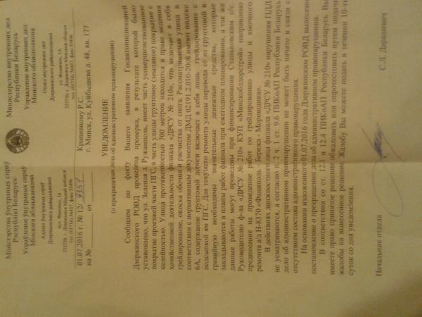 Огромную Благодарность выражаю Старшему инспектору Панченко А.Ю. Дзержинского РОВД, Начальнику технического надзора УКСа Дзержинска и Начальнику филиала "ДРСУ-210" за содействие и поддержку