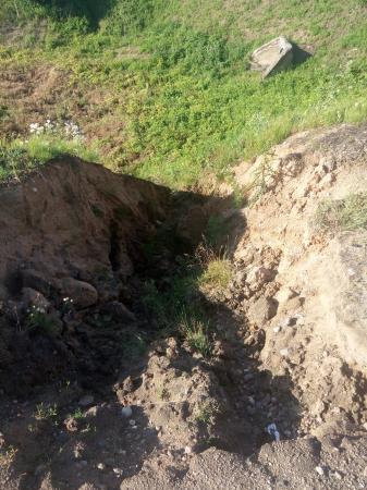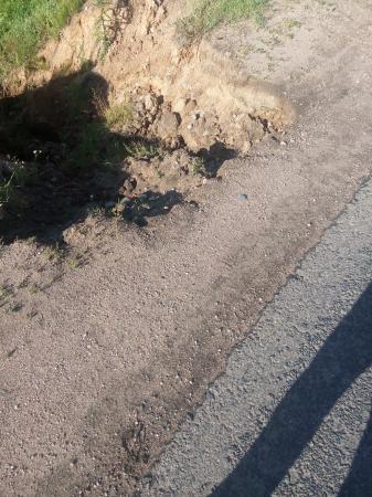Ежегодно сильно размывается обочине. Есть высокая вероятность подмыва и обрушения д.полотна. Засыпать яму не приводит к нужному результату. Проще сделать здесь слив.