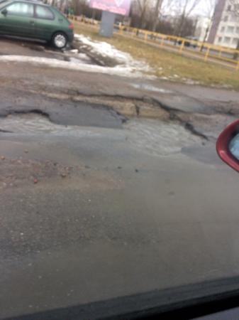 дорога разбита при вьезде к гостинице вояж якубовского 52 а, до магазина Радзивиловский ,якубовского 60. Нет возможности проехать и 5 метров по ровной дороге, вся дорога покрыта водой от таяния снега, и не видно ям.