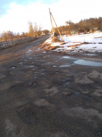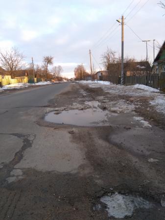 Правая сторона по направлению на дубовый лес,в начале деревни- просел асфальт в 4-х местах.повороты в центре деревни-дорога разбита,вся в ямах.