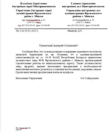 Получил ответ из РОВД(посылал запрос по email на сайт ГУВД с просьбой направить начальнику ГАИ Фрунзенсого района), а воз и ныне там: ямы ещё больше, знаков нет (как обещали в ответе). Готовлю жалобу в суд.