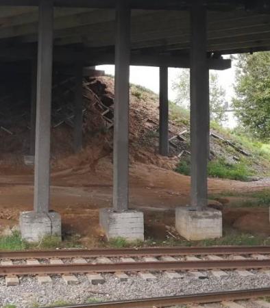 Под мостом М1, на въезде в д.Серафимово (Минский р-н) что-то произошло и буквально за месяц дождей образовалась огромная канава. Прошу отремонтировать, пока не произошла деформация опор и не треснул мост.