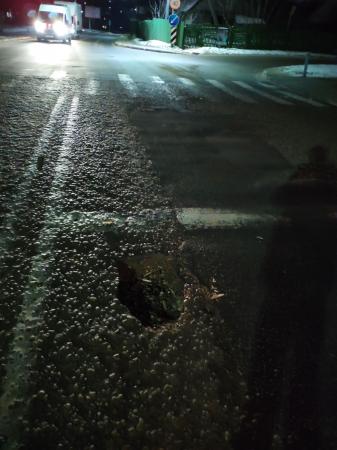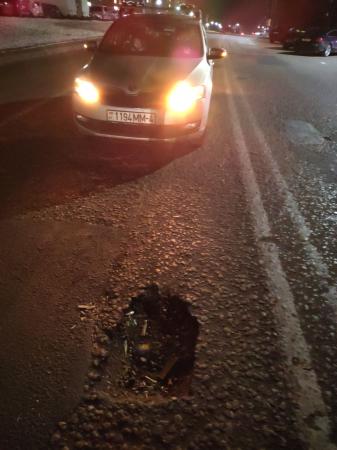 г.Гродно, в районе стоп линии перед светофором на пересечении улиц Калиновского и Санфирова, при движении в сторону центра, по левой полосе находится яма, которая не обозначена и аболютна не видна, особенно в темное время суток. Находится как раз на пути движения левого переднего колеса машины если двигаться по центру полосы.